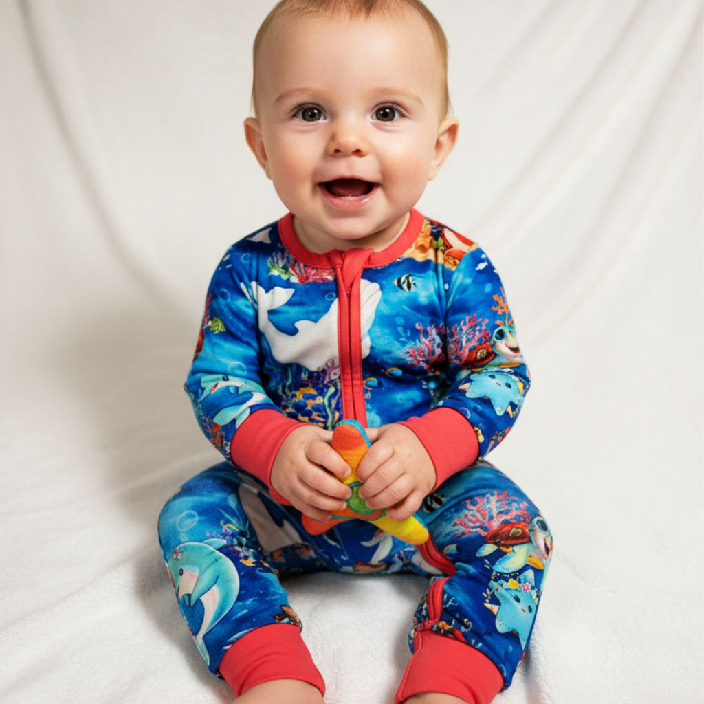 Little boy sitting wearing ocean-themed bamboo zippy by Kai Blue