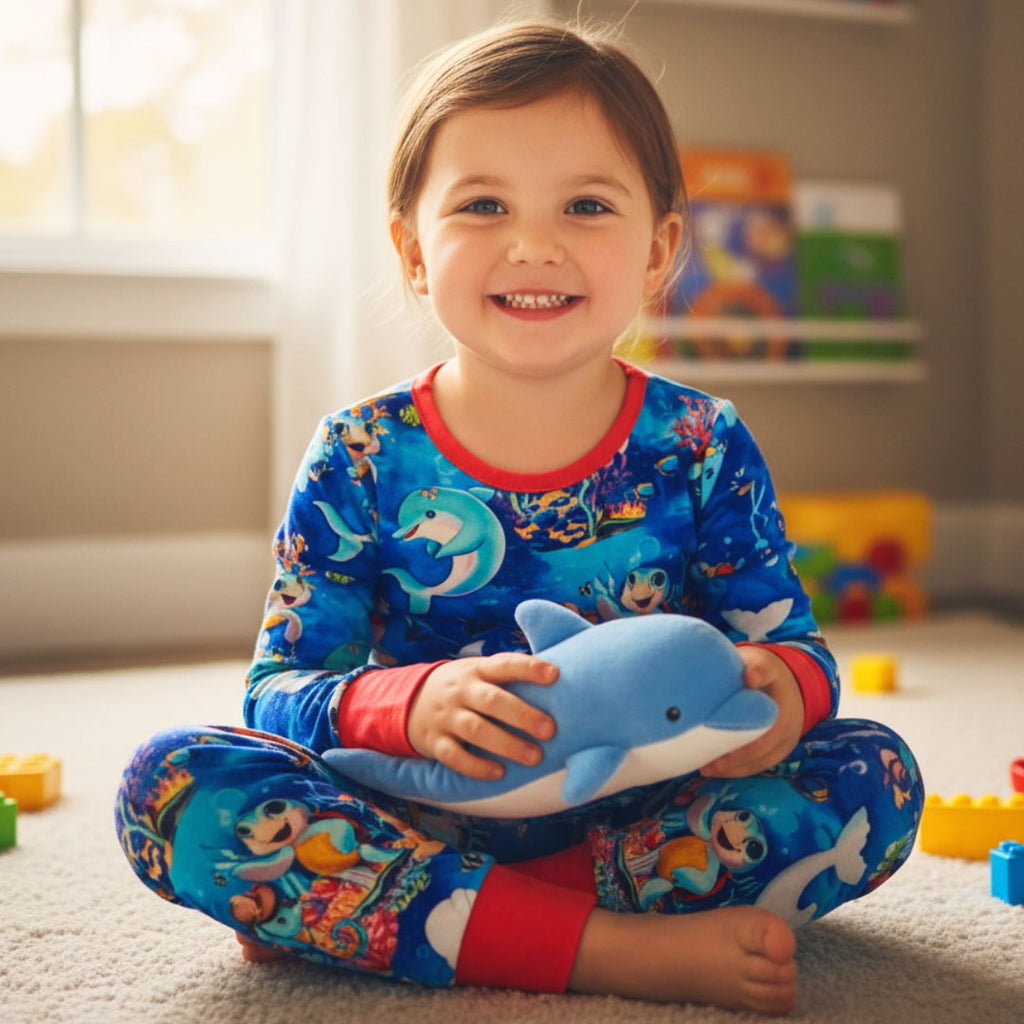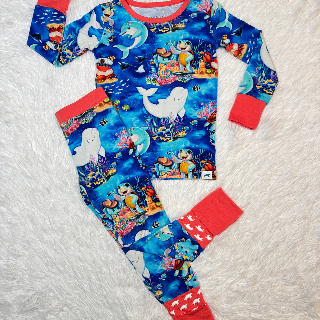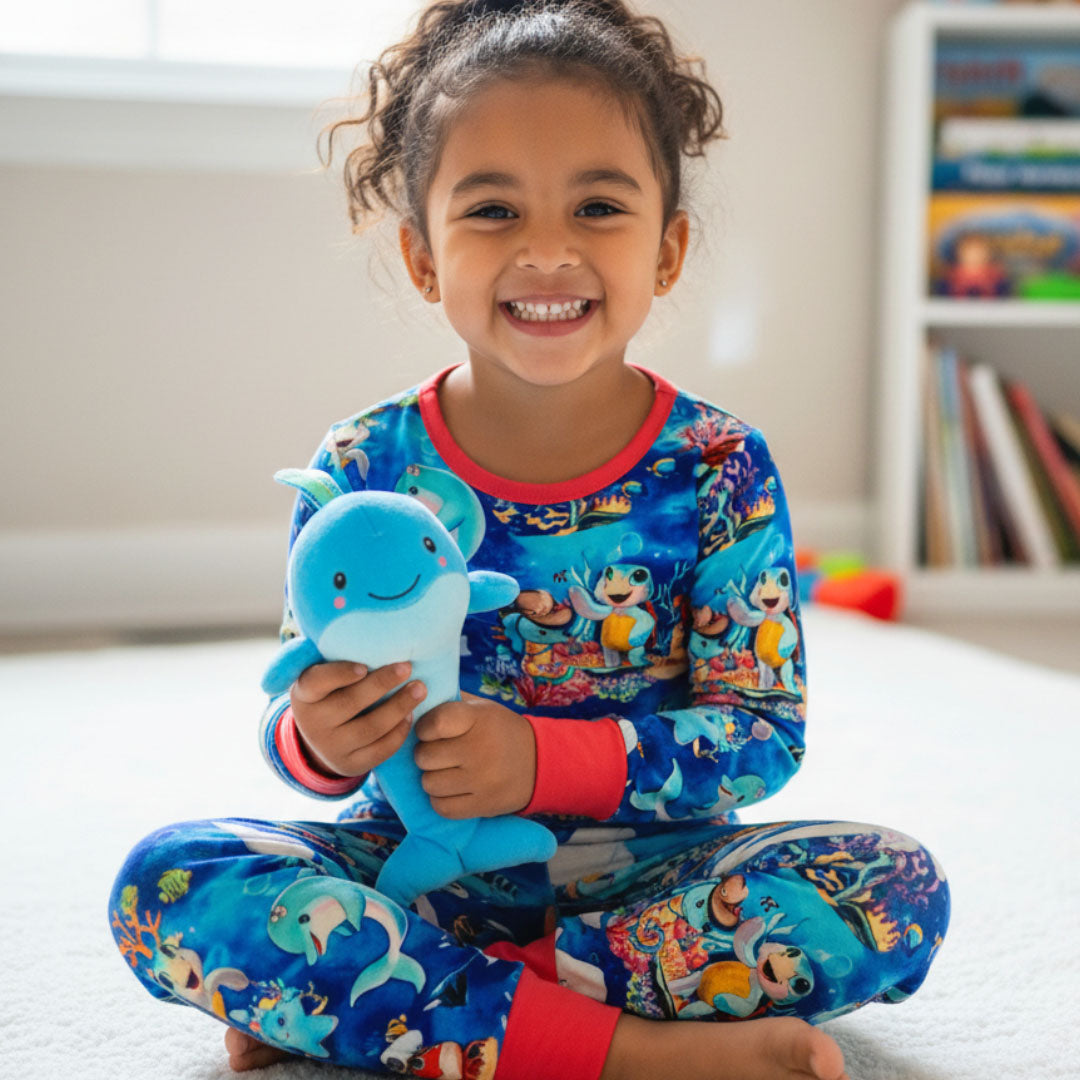 Experience ultimate comfort with this 2-piece bamboo pajama set featuring our hand-drawn print featuring The Kai Blue Crew™:
