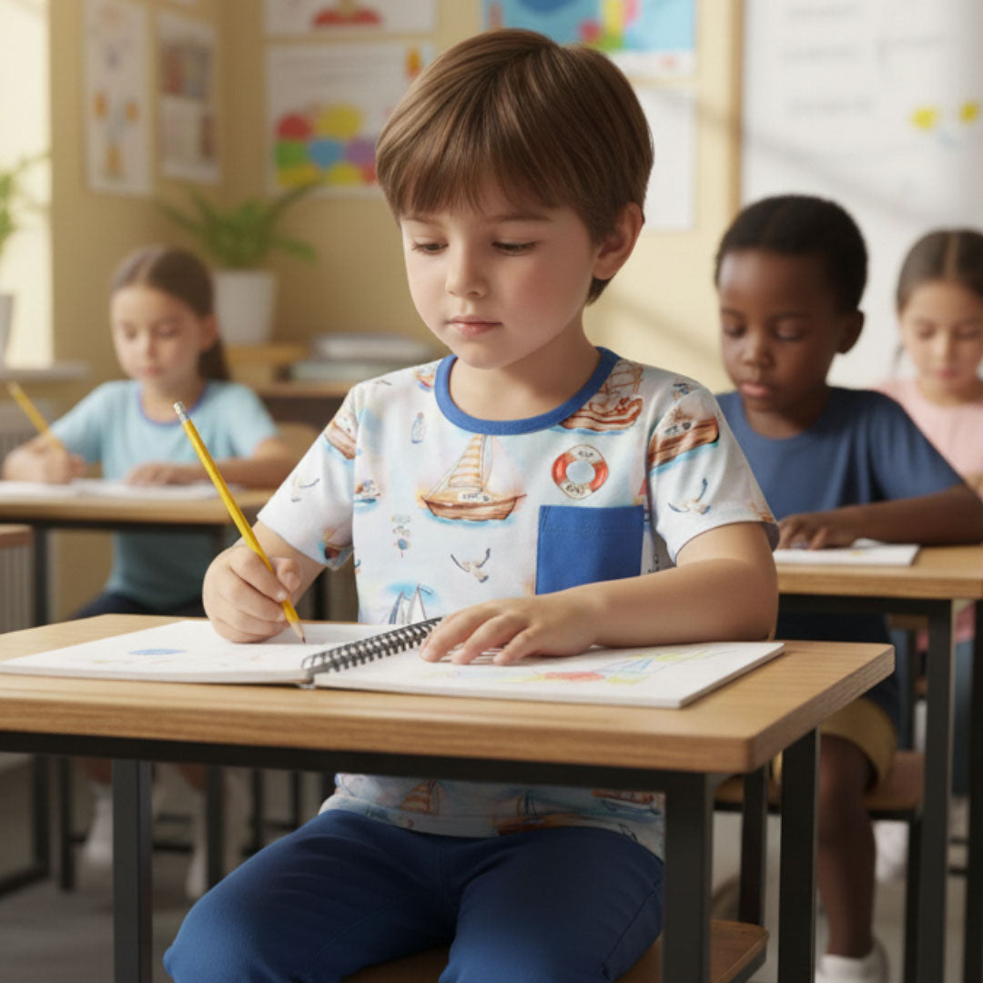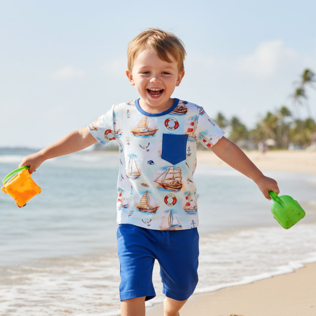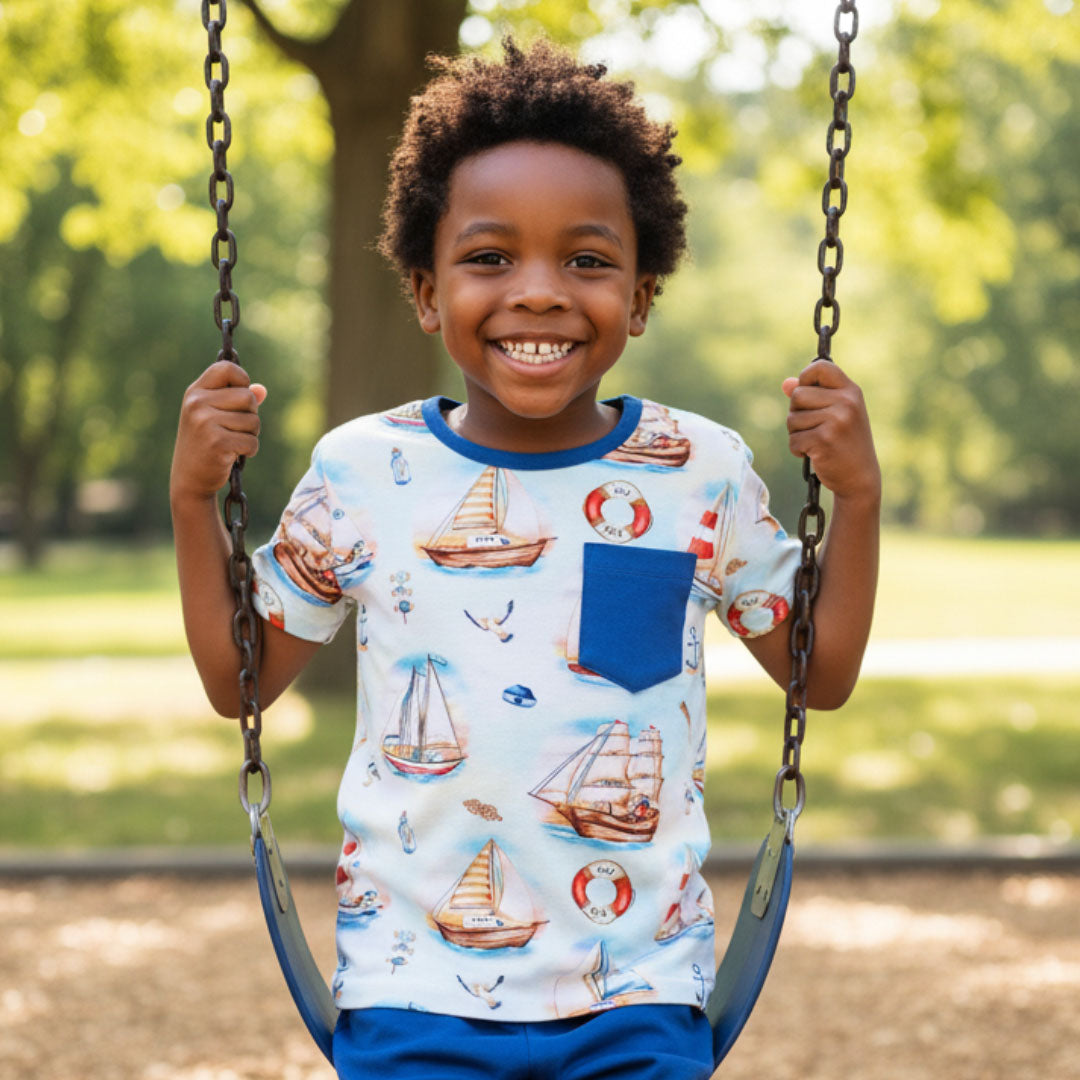 Kai Blue's™ bamboo pocket tee shirt is an excellent choice and offers a combination of softness, breathability, durability, and eco-friendliness. It is naturally gentle and hypoallergenic, which makes it ideal for sensitive young skin, preventing irritation and keeping kids comfortable throughout the day. Moisture-wicking and breathable, helping regulate body temperature by keeping kids cool in warm weather and cozy in cooler temperatures.